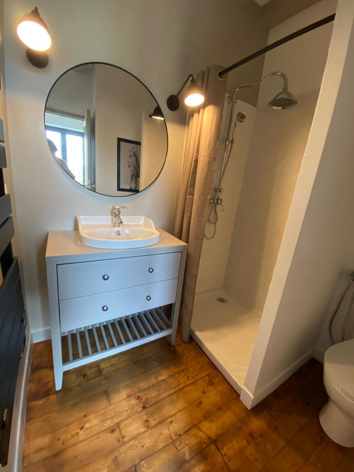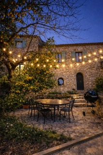 Un jardin arboré avec terrasse en bois et jeux de boules d'environ 100m2. Une cave et un garage. Exposition OUEST. Calme. Proximité immédiate du village.