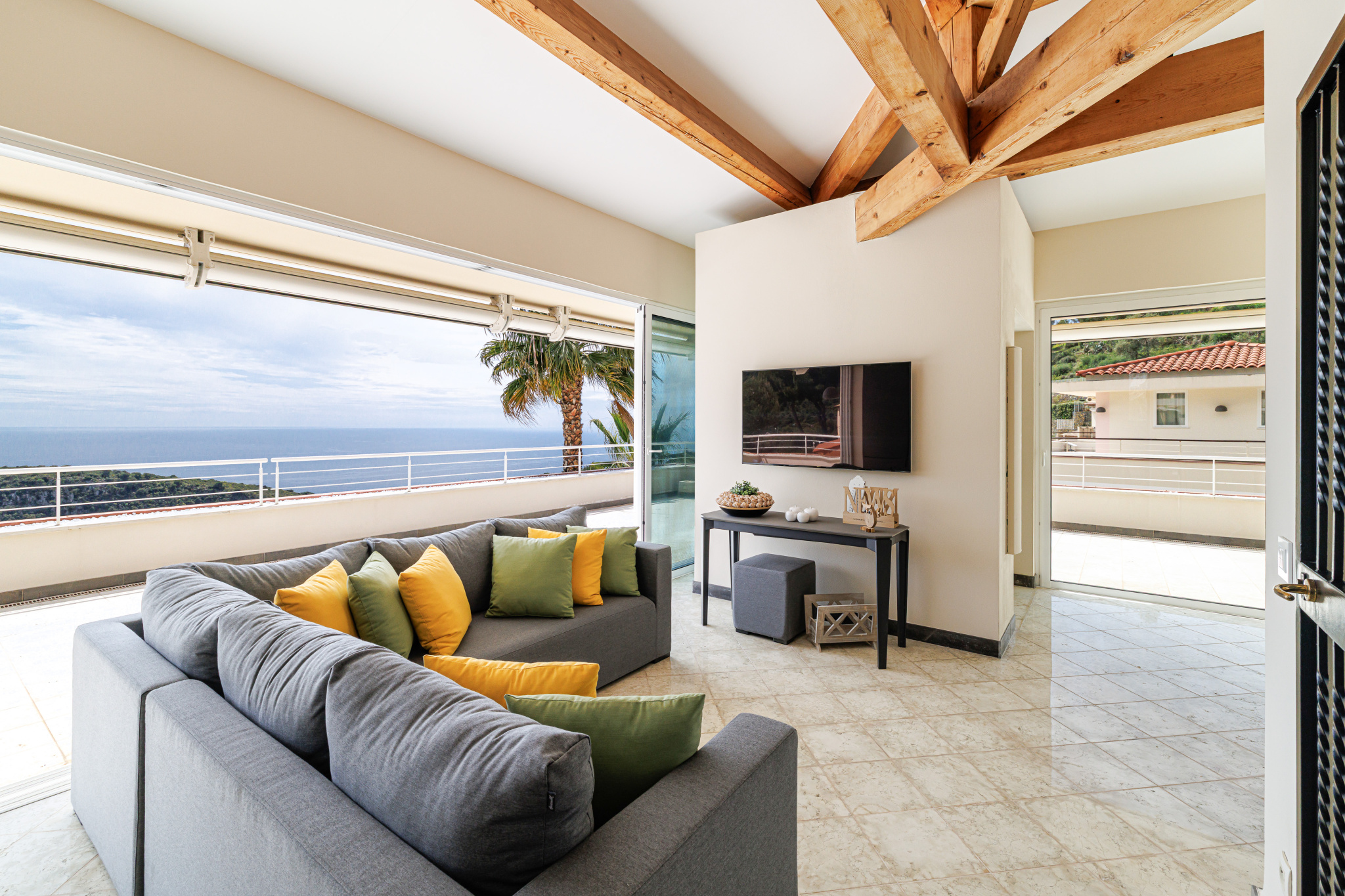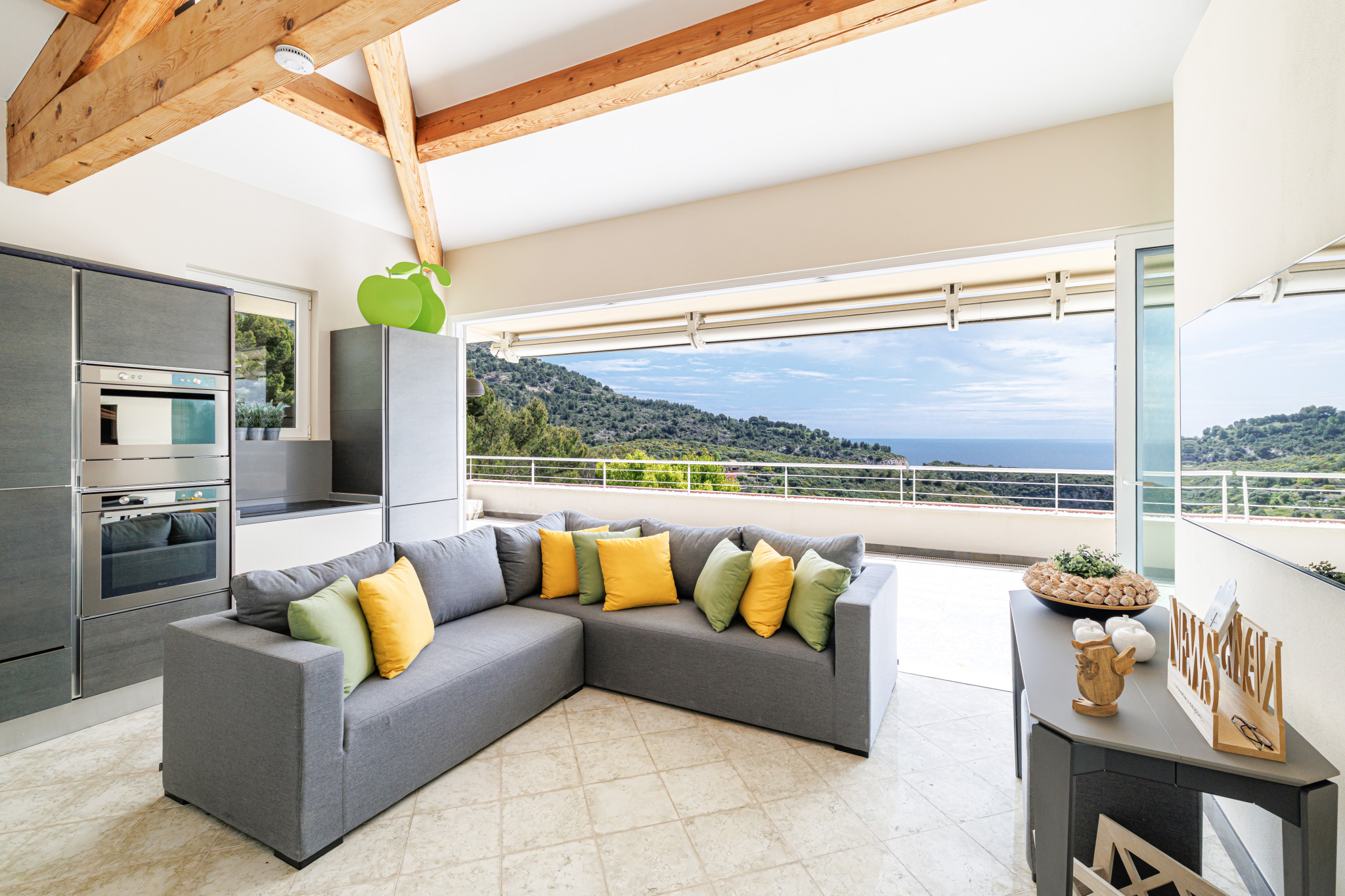 - Roof-terrasse aménagé avec cuisine et salon, parfait pour dîner face à la mer.