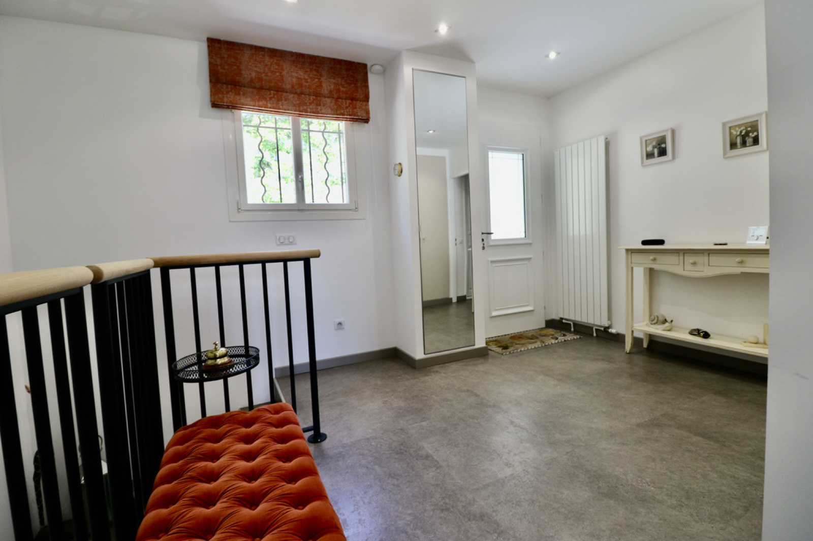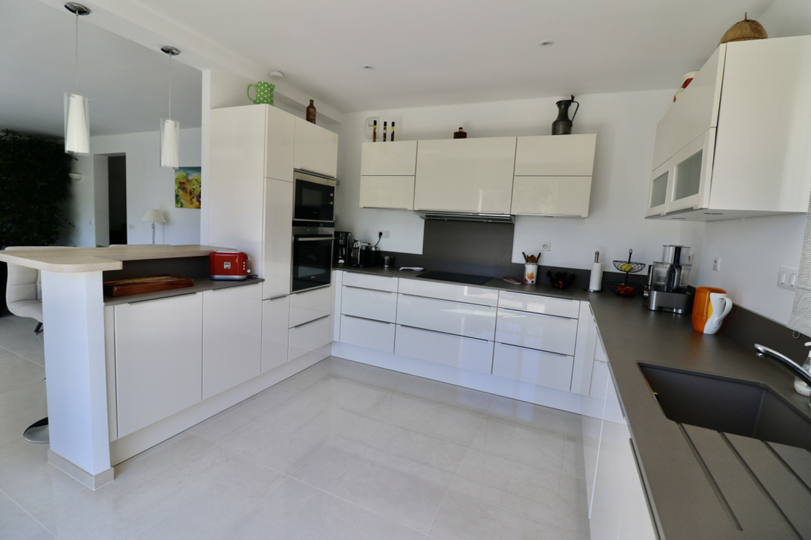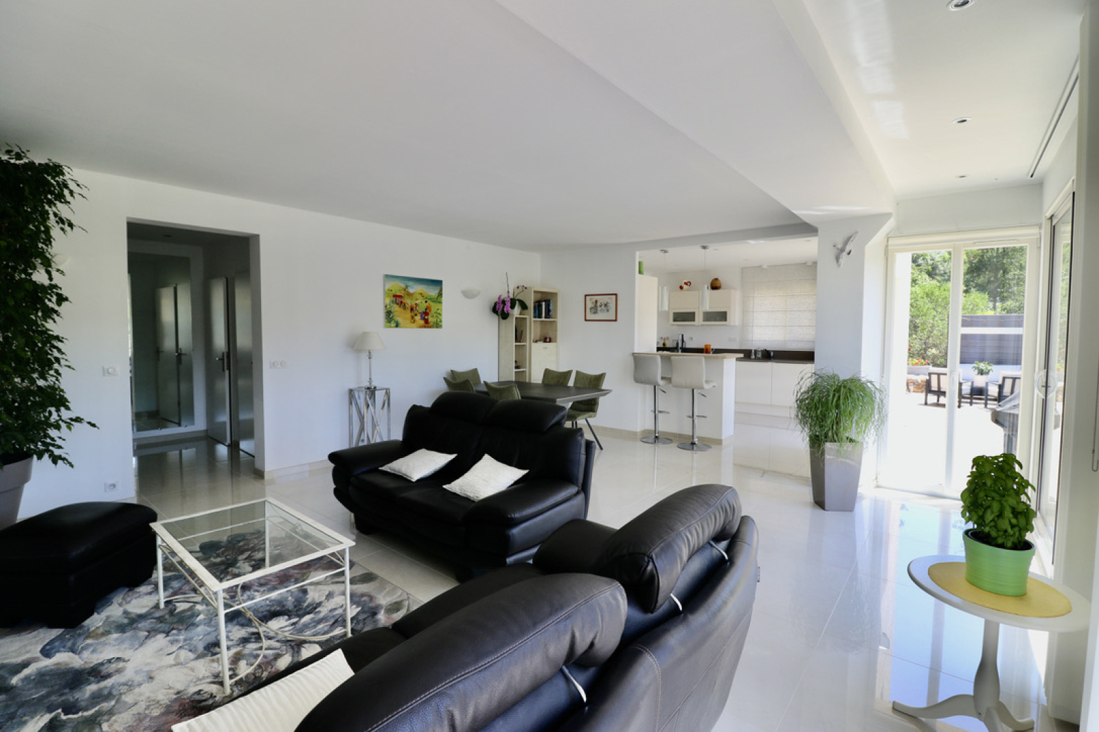 A l'étage inférieur : grand séjour lumineux avec cuisine américaine equipée, toilettes invités, buanderie.