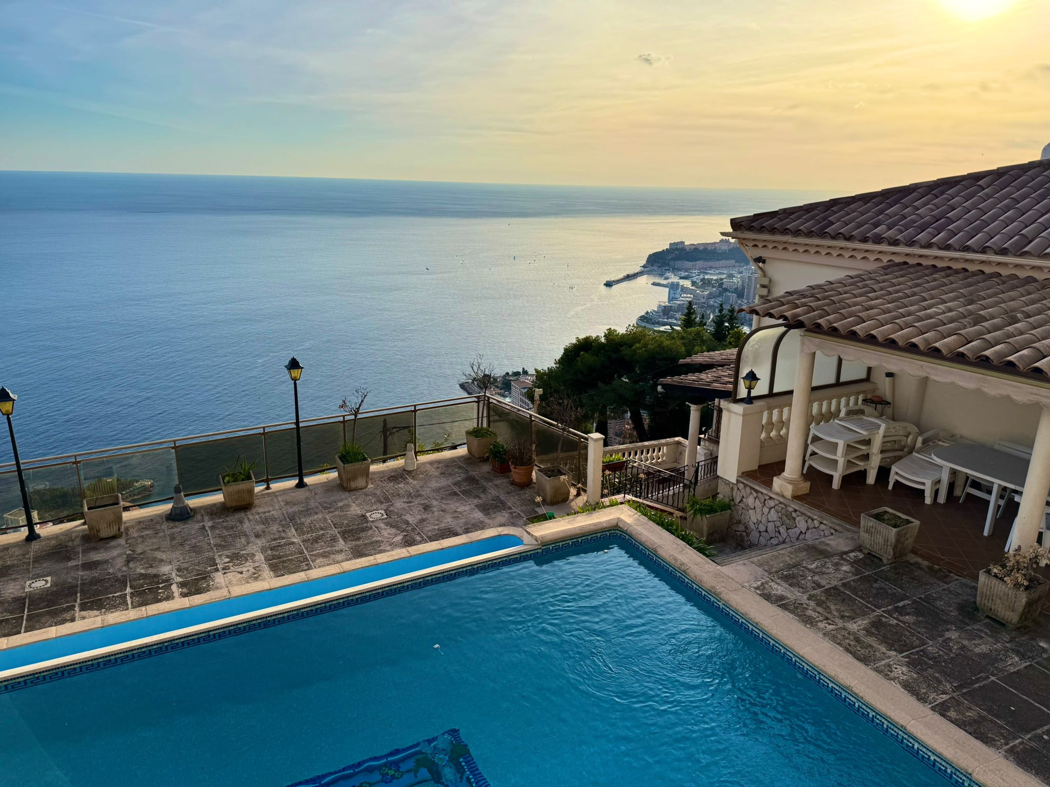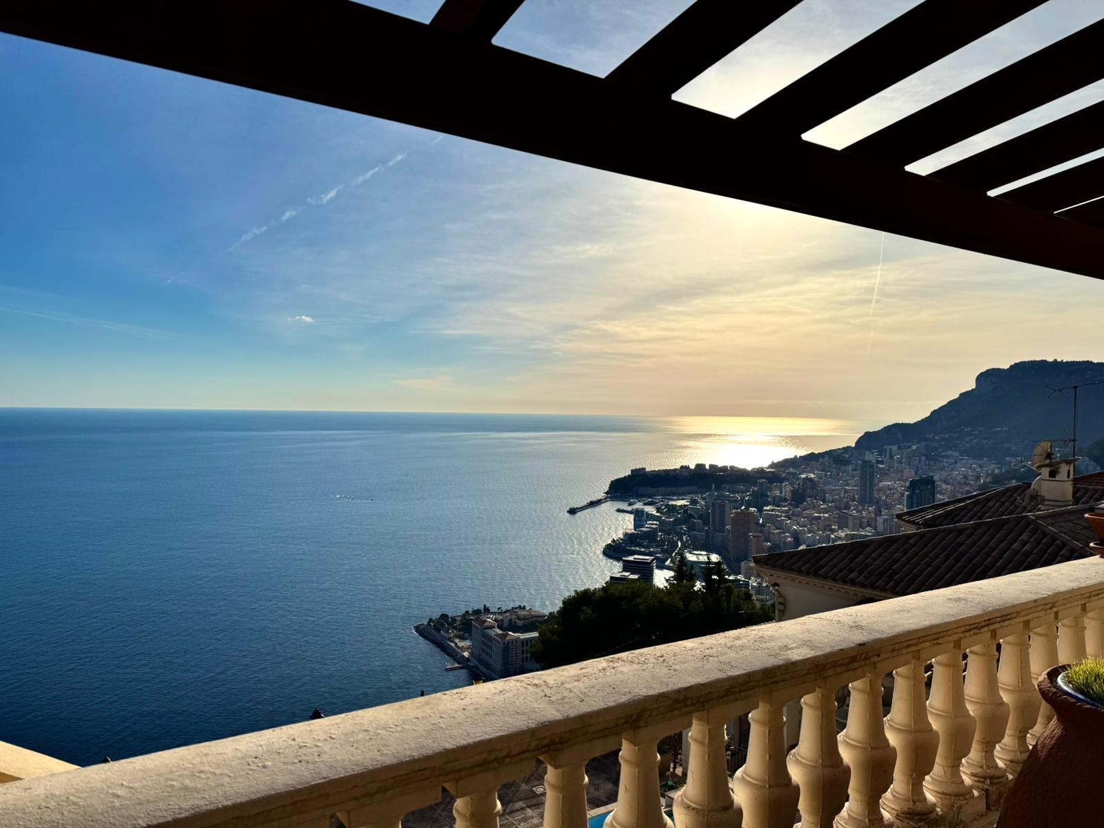 Magnifique propriété provençale de 200 m2 surplombant la mer et Monaco avec piscine, garages et multiples parkings. La propriété se compose comme suit : une entrée, une chambre froide, une cuisine équipée, un grand séjour cathédrale avec cheminée et salle à manger, un deuxième séjour, un WC invité, un bureau, une chambre maître, une salle de bains avec WC. A l'étage, une chambre avec salle de douche et WC, un appartement deux pièces de 25m2 avec cuisine, salle de douche, WC et une grande terrasse, une grande salle de gym de 25m2 avec une grande terrasse, une grande piscine éclairée avec banc jacuzzi avec cuisine d'été, local technique, douche et WC. Une serre, un double garage et un garage et plusieurs parkings completent ce bien. Reservoir d'eau. Propriété à 10 minutes de Monaco. Pas de vis-à-vis.