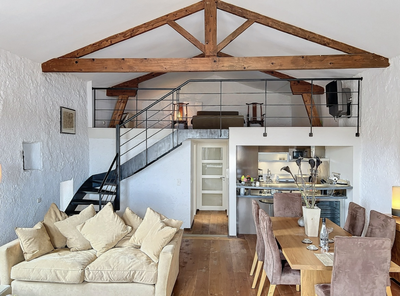VILLEFRANCHE-SUR-MER CENTRE HISTORIQUE MAGNIFIQUE LOFT 3 PIECES DE 98M2 EN DUPLEX ENTIEREMENT RENOVE, VUE MER, A DEUX PAS DE LA PLAGE. CE LOFT EN DERNIER ETAGE SE COMPOSE COMME SUIT: ENTREE, SEJOUR/SALLE A MANGER CATHEDRALE AVEC POUTRES APPARENTES, CUISINE US DESIGN EQUIPEE, UNE GRANDE CHAMBRE EN MEZZANINE, UNE DEUXIEME CHAMBRE, UNE TRES BELLE SALLE D'EAU AVEC WC. TRES LUMINEUX ET SPACIEUX. BEAUCOUP DE CHARME.