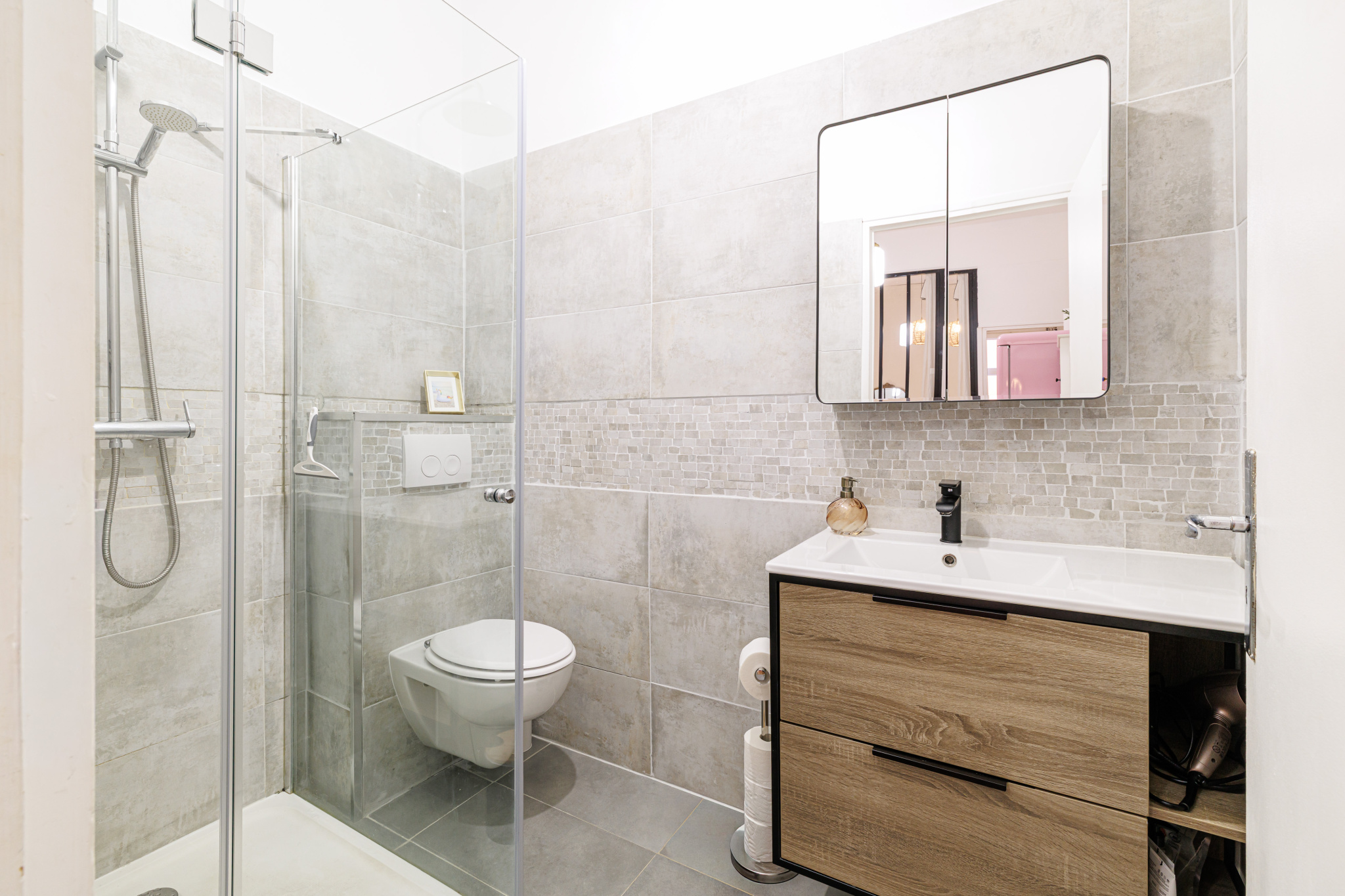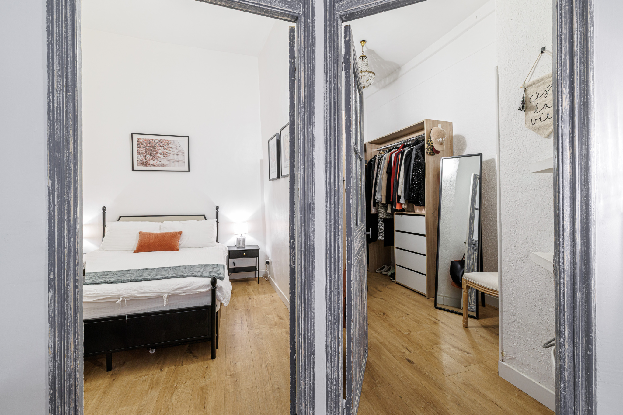 Il se compose d'un séjour, de deux chambres, d'une cuisine, d'une salle de douche, d'Un WC, d'un grand dressing et d'un placard. L'appartement se situe au 1er étage d'un bâtiment typique et dispose d'une entrée privative.